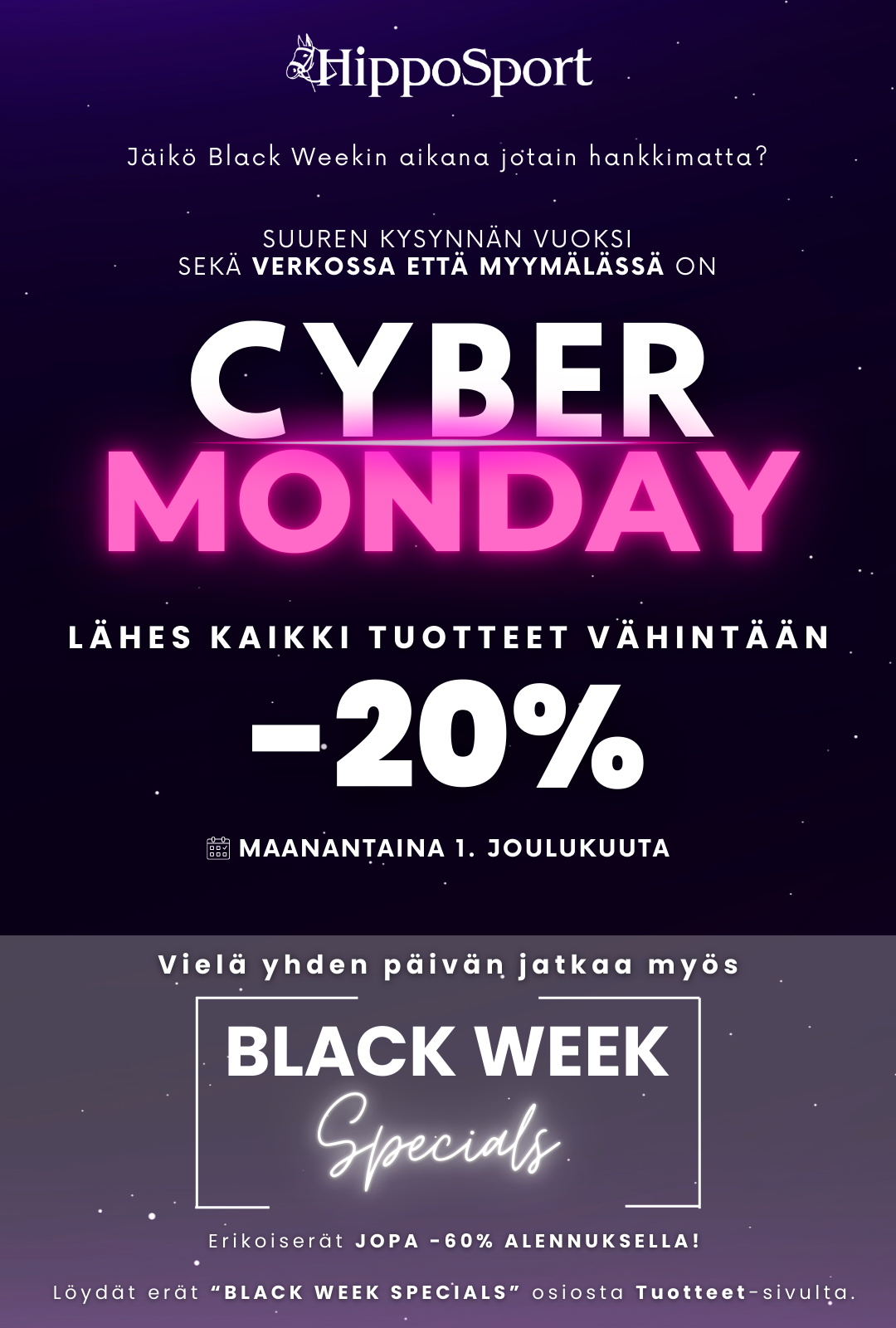Hipossa BLACK WEEK ja huipputarjoukset koko viikon ajan! Lähes kaikki tuotteet ainakin -20% alennuksella Muutamia tuotemerkkejä -30% Erikoiseriä jopa -60%, shoppaile erikoiserät täältä! Krafft rehut ja muut tuotteet -10%