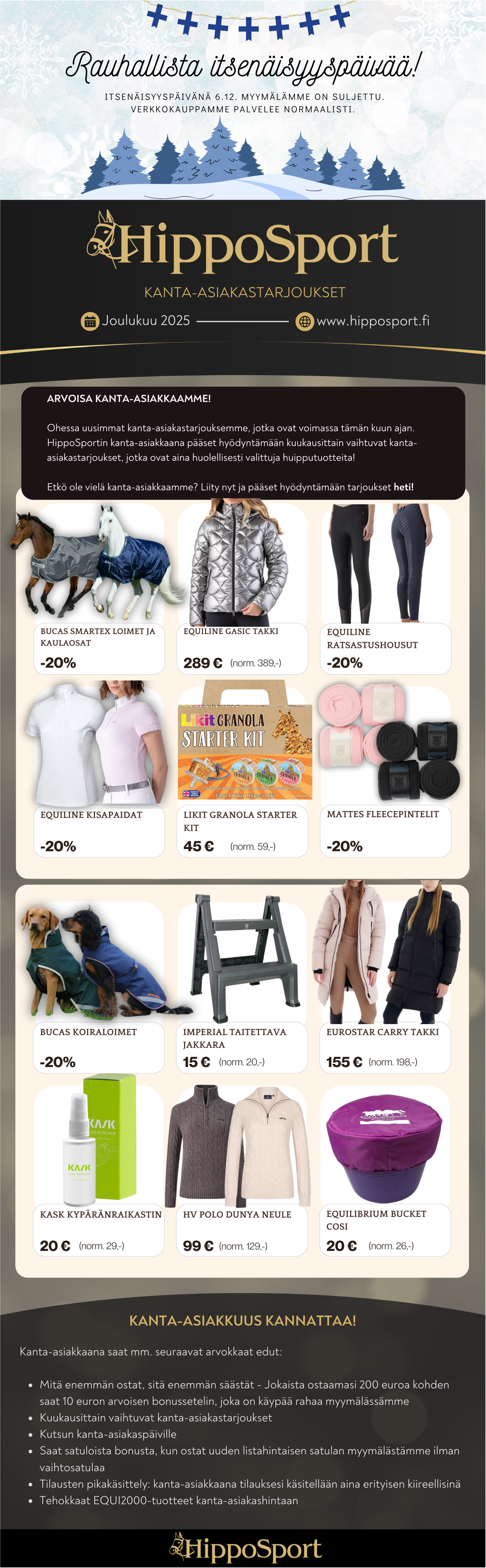 Hipossa BLACK WEEK ja huipputarjoukset koko viikon ajan! Lähes kaikki tuotteet ainakin -20% alennuksella Muutamia tuotemerkkejä -30% Erikoiseriä jopa -60%, shoppaile erikoiserät täältä! Krafft rehut ja muut tuotteet -10%