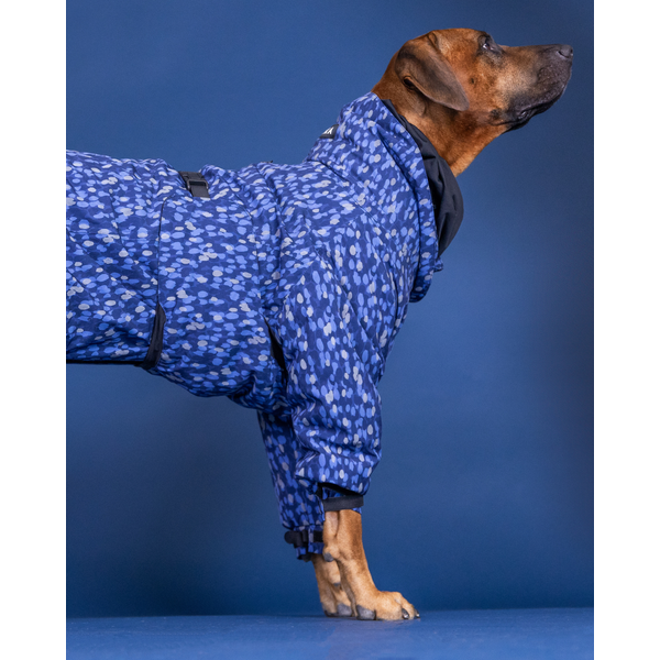 Heijastava, hauska palloprintti lisää turvallisuutta pimeällä ja tekee haalarista näyttävän valinnan talvikauteen. Vedenpitävä huppu estää veden ja kylmän valumisen kauluksen sisään – halutessasi voit suojata myös koirasi korvat.