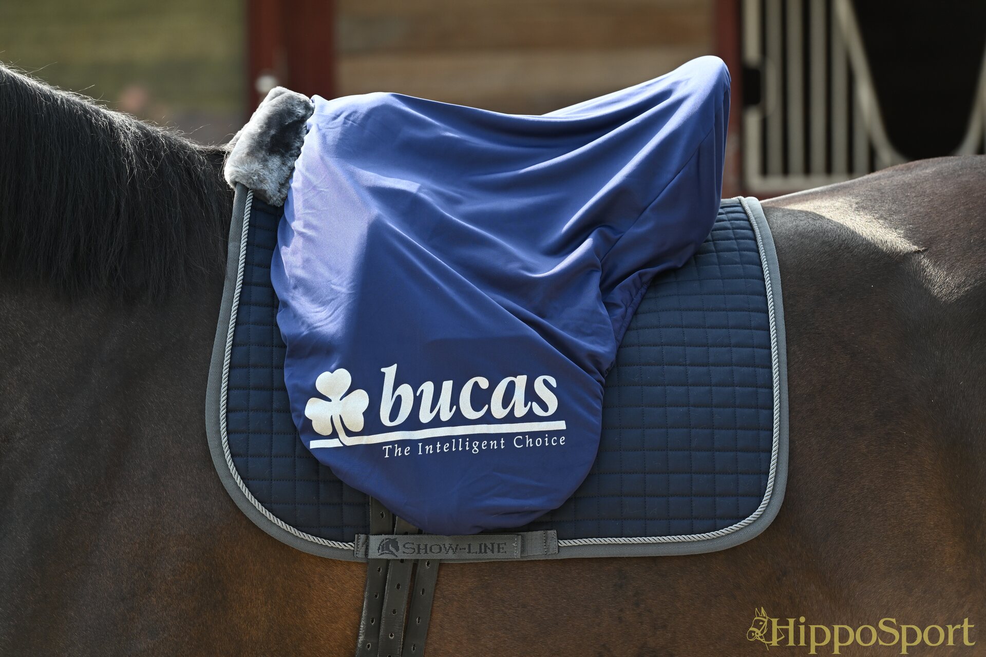 Satulansuojus Bucas-logolla. Suojassa liukas ulkopinta ja pehmeä sisäpinta. Kiristysnauha pitää satulansuojan hyvin paikallaan. Joustavuutensa ansiosta sopii useimpiin 15''-18'' este- ja koulusatuloihin.
