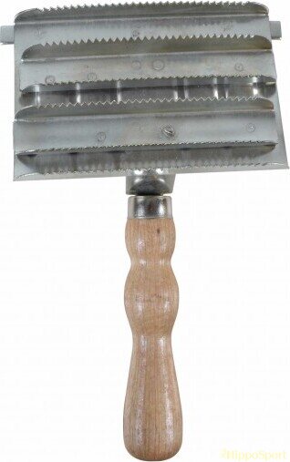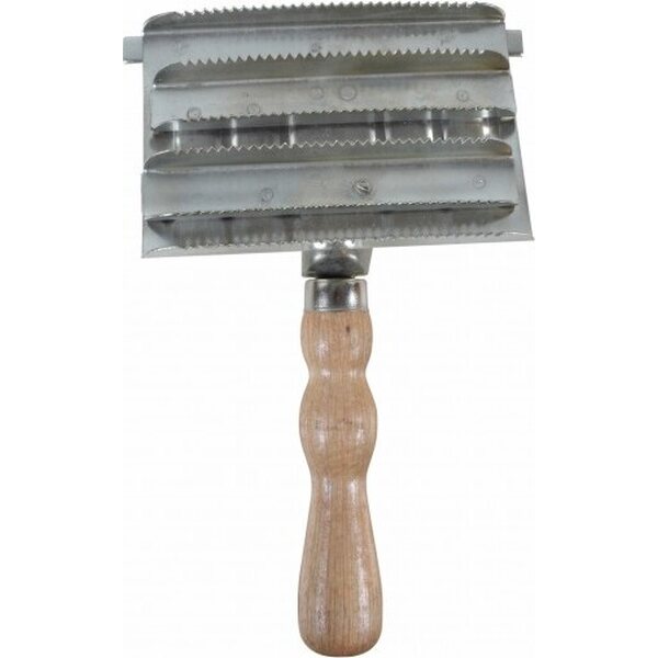 Perinteinen metallinen suka puisella varrella. Näppärä karvanlähtöaikaan ja paksulle karvalle!