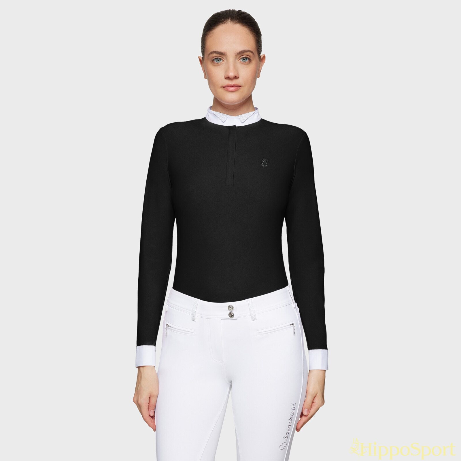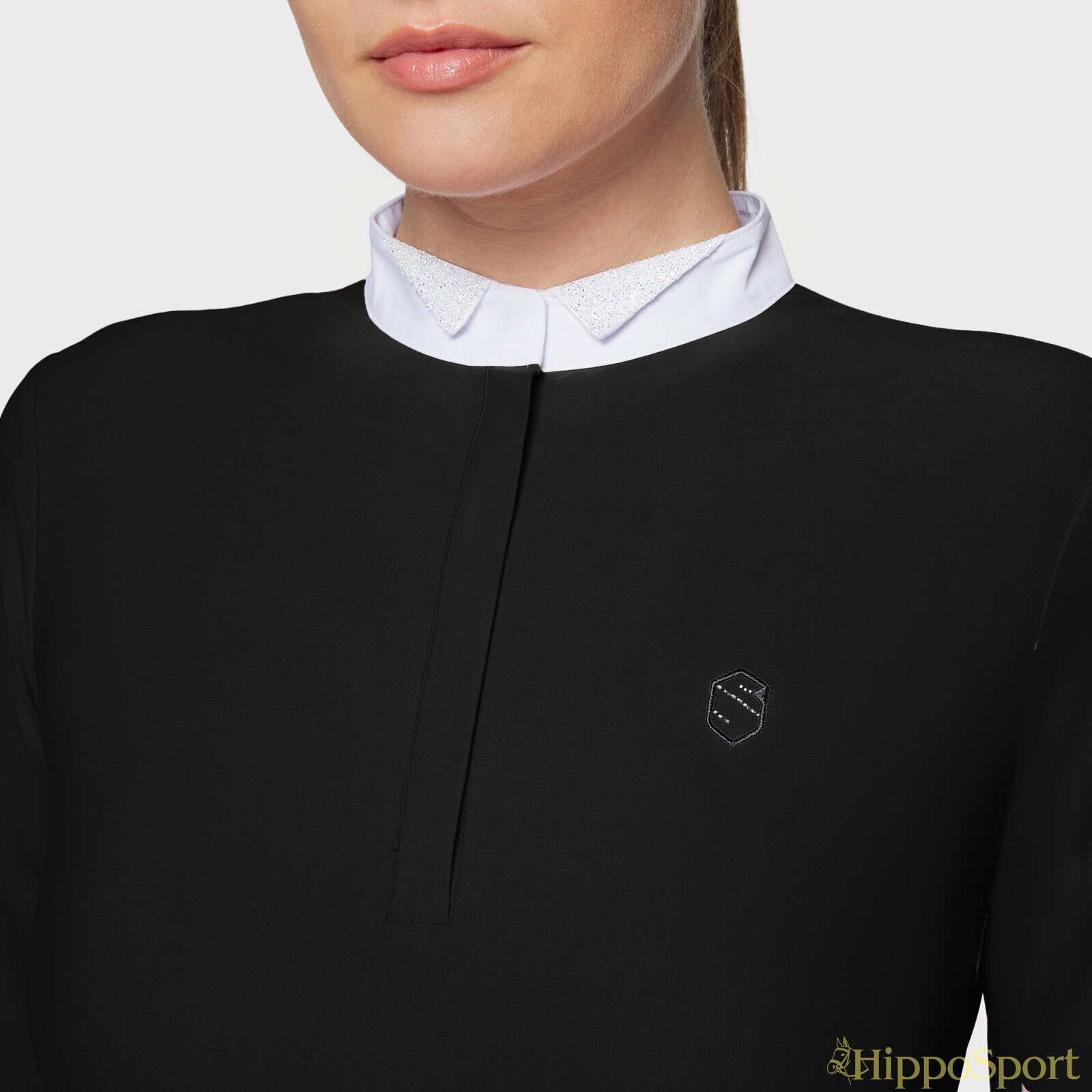 Paitaa koristavat pitkät, ilmavat verkkohihat, klassinen valkoinen kaulus sekä tyylikäs Samshield-logo rinnassa. Hihansuita somistavat Swarovski®-napit, ja kauluksen alla kulkeva puolipitkä vetoketju on viimeistelty hienovaraisella Swarovski® Crystal Fabric -koristelulla ja magneetilla, joka pitää kauluksen napakasti kiinni.
