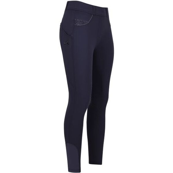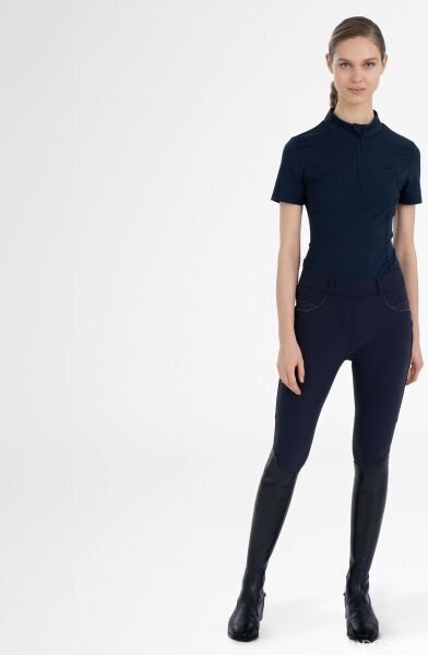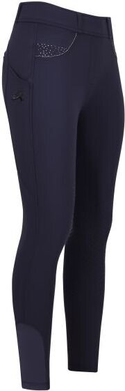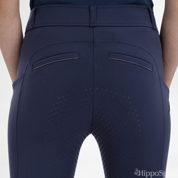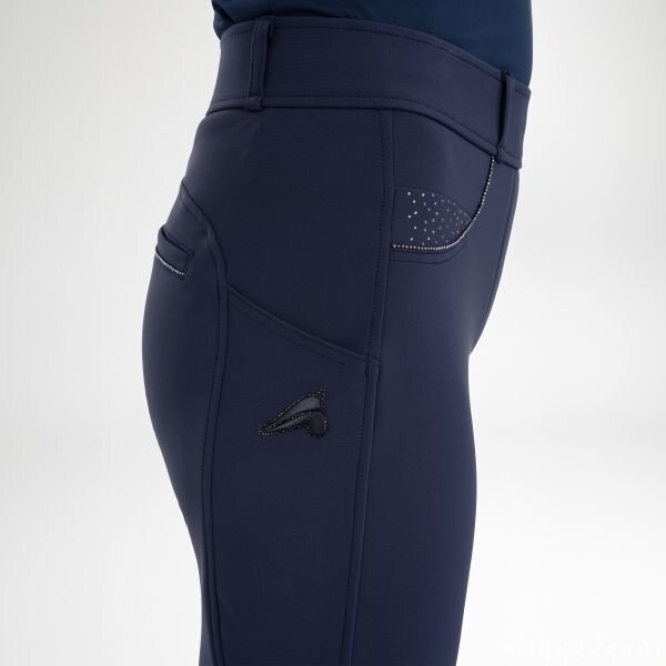 Muotoiltu takahelma luo elegantin ja imartelevan siluetin. Hienostuneet yksityiskohdat – metalliketjukoristeet, etutaskujen hillityt strassit sekä kivillä koristeltu brodeerattu logo – tuovat kokonaisuuteen ripauksen ylellisyyttä. Brändätty silikoninen kokogrippi varmistaa optimaalisen pidon satulassa, ja molemminpuoliset puhelintaskut pitävät tärkeät tavarat turvallisesti mukana. Takana valetaskuyksityiskohdat viimeistelevät huolitellun ilmeen.