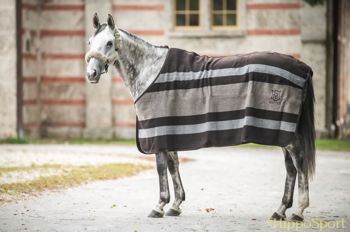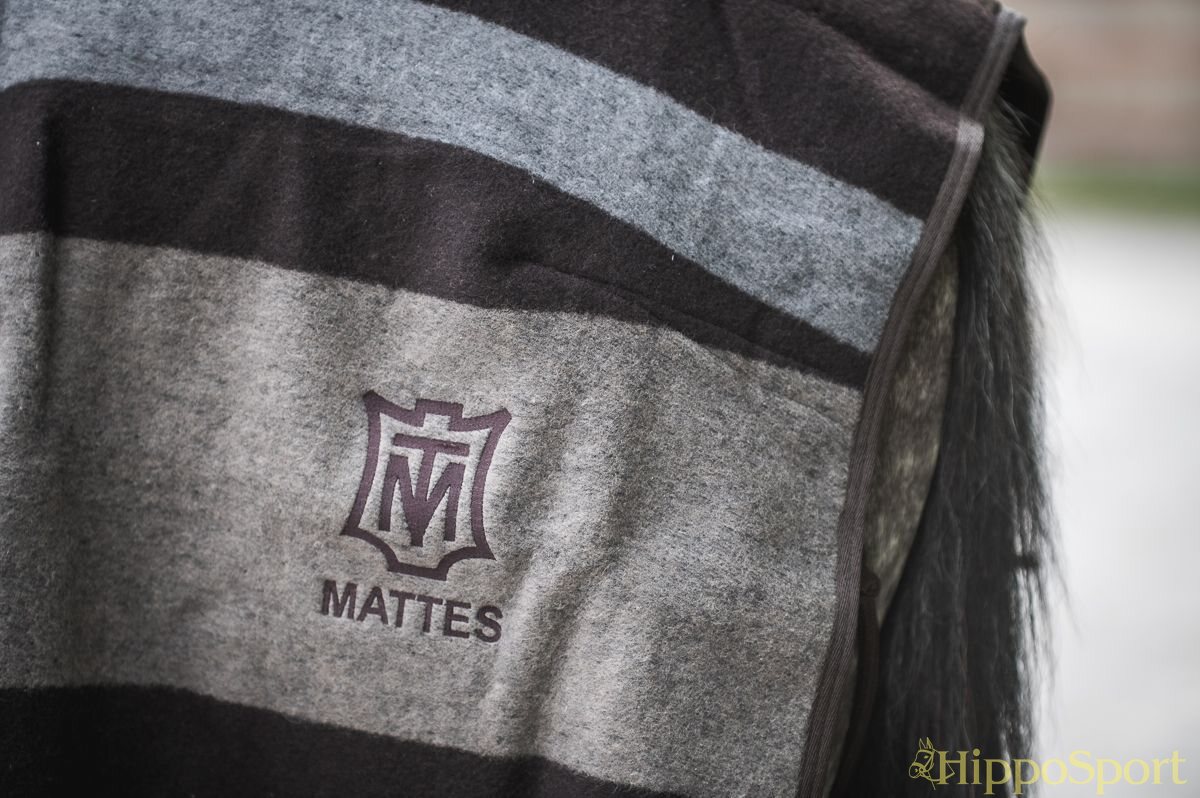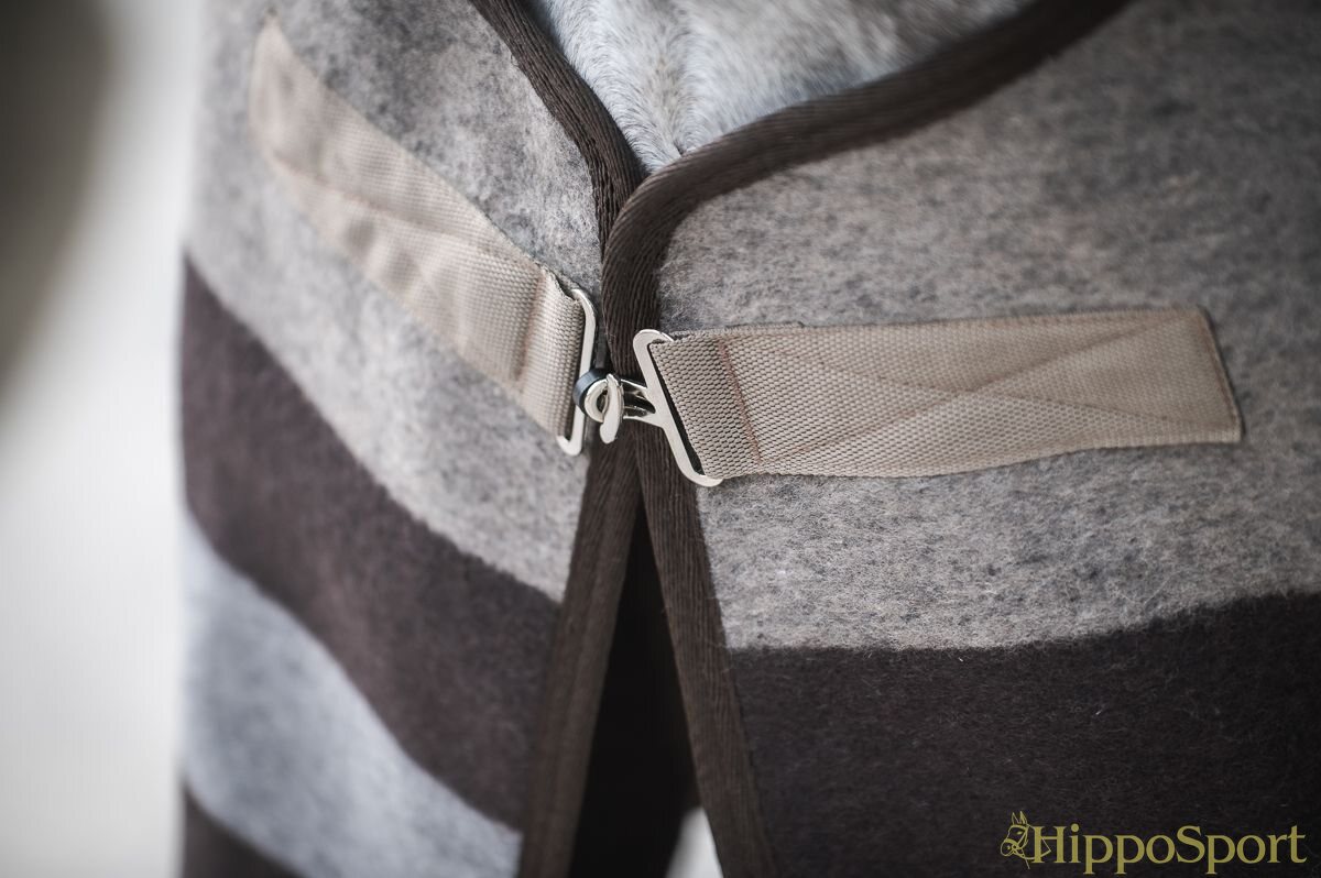 Laadukas Mattes villaloimi paksua villaa. Kaunis sini-harmaaraidallinen kuosi ja mustat, nahkaiset yksityiskohdat.